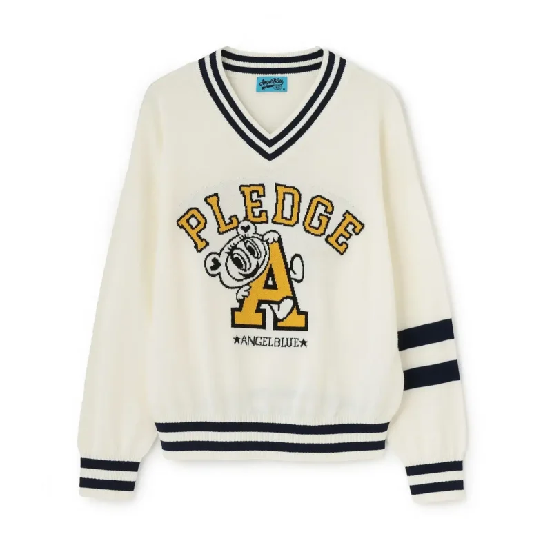 スクールガール気分を盛り上げるカレッジロゴ入りのチルデンセーター。