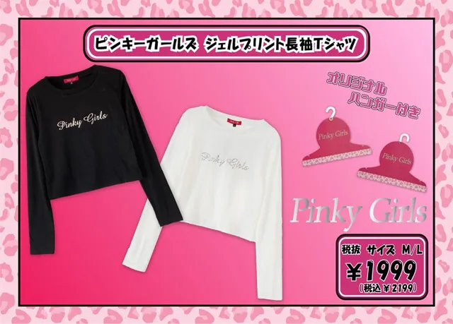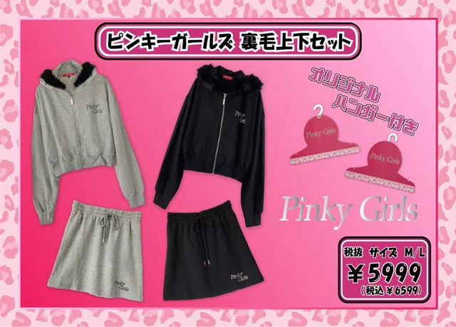 me Janeでは、ボリュームのあるファーの付いたヒョウ柄上下セットやラグランTシャツなどを、Pinky Girlsでは、ベロア上下セットや立体感のあるジェルプリントTシャツを展開!