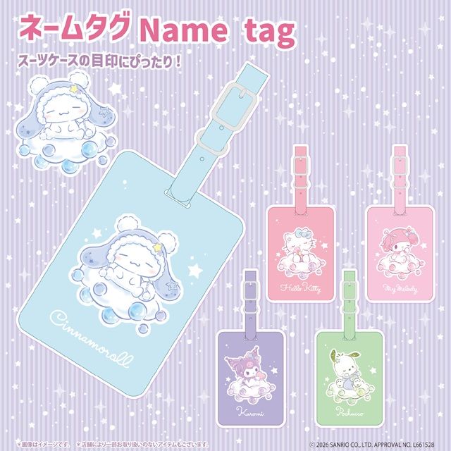サンリオキャラクターズのふわふわワッペンが付いたネームタグ。お布団部分はポケットになっています!
