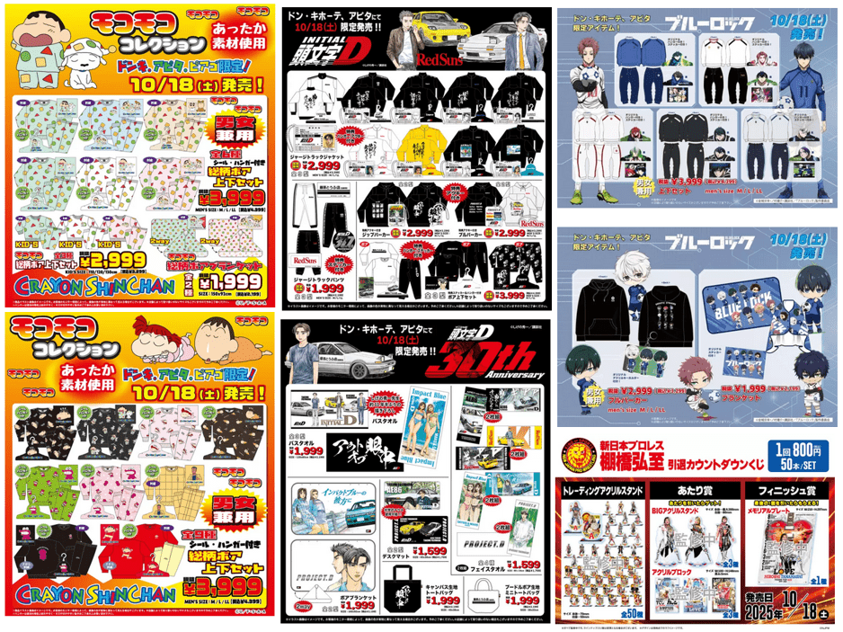 ドン・キホーテでは、2025年10月18日(土)~頭文字D、クレヨンしんちゃん、ブルーロック、新日本プロレス 棚橋弘至 引退カウントダウンくじなどのコラボを販売します!