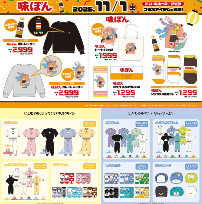 ドン・キホーテでは、2025年11月1日(土)~にしむらゆうじ×サンリオ、味ぽんなどのコラボを販売します!