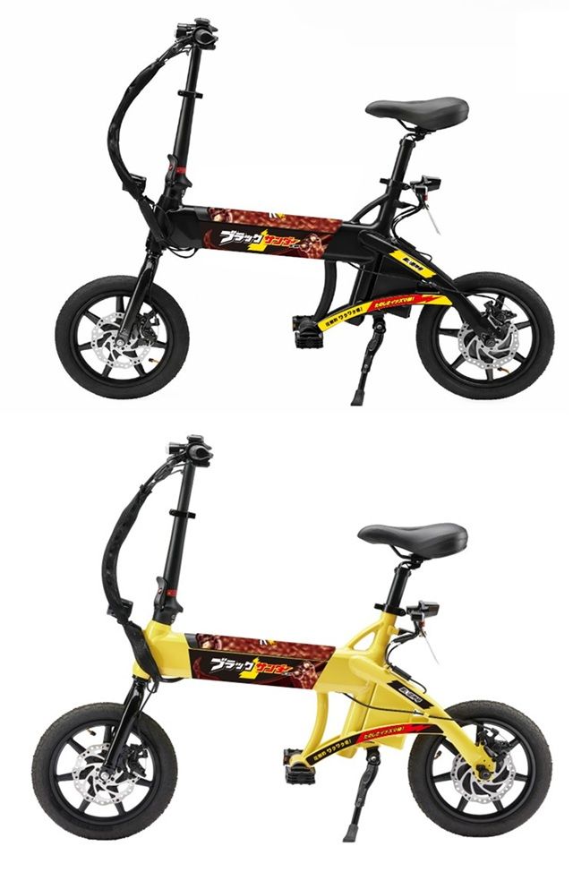 【内容】16歳以上なら免許不要で運転できる電動サイクル。ブラックサンダーのデザインが施されたファミマオンライン 限定で購入可能な商品です。