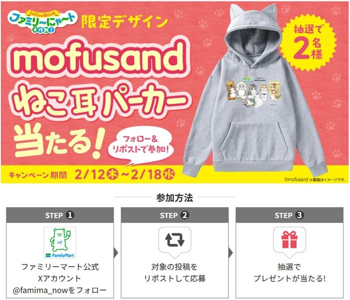 ファミリーマート公式Xアカウント@famima_nowをフォローし、対象の投稿をリポストすると抽選で「mofusand ×ファミリーマート限定デザインねこ耳パーカー」が2名様に当たります。