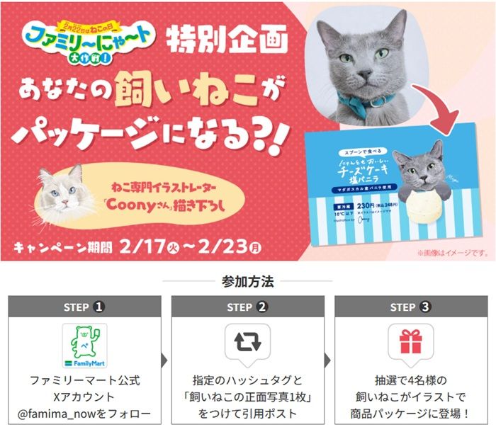 ファミリーマート公式Xアカウント@famima_nowをフォローし、指定のハッシュタグ「#ファミリ~にゃ~ト大作戦」と「飼いねこの正面写真1枚」をつけて引用ポストすると抽選で4名様の飼いねこがイラストで商品パッケージに登場します。