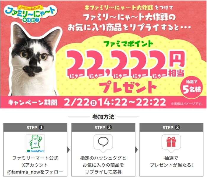 ファミリーマート公式Xアカウント@famima_nowをフォローし、対象の投稿に指定のハッシュタグ「#ファミリ~にゃ~ト大作戦」をつけてファミリ~にゃ~ト大作戦のお気に入り商品をリプライすると抽選で「22,222円相当のファミマポイント」が5名様に当たります。さらに、対象の投稿にいいねすると当選確率がアップします。