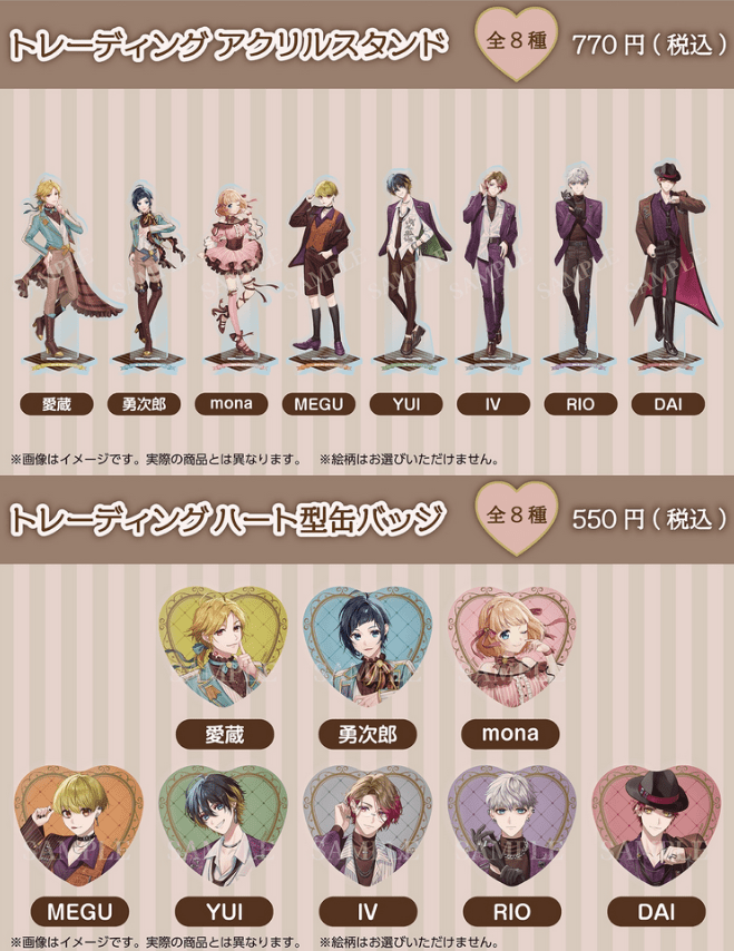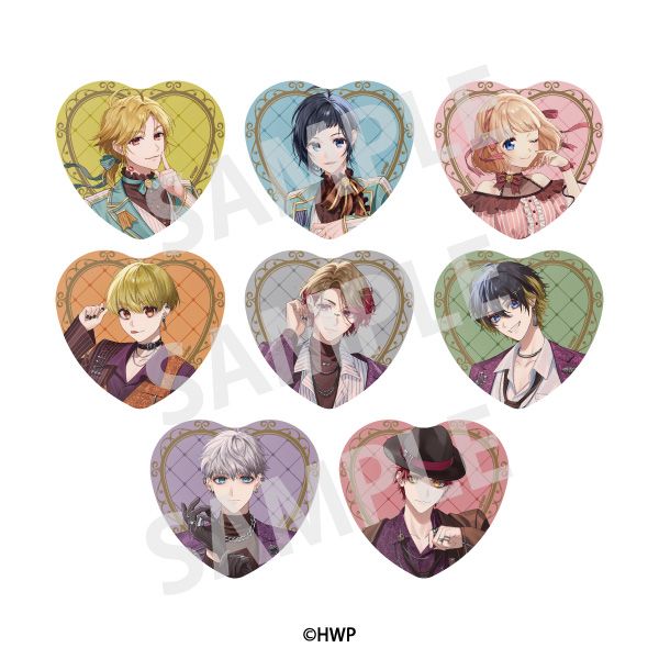 『HoneyWorks』アイドルシリーズ8名の限定描きおろしイラストを使用した、トレーディングハート型缶バッジです。