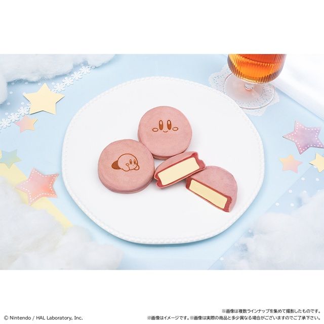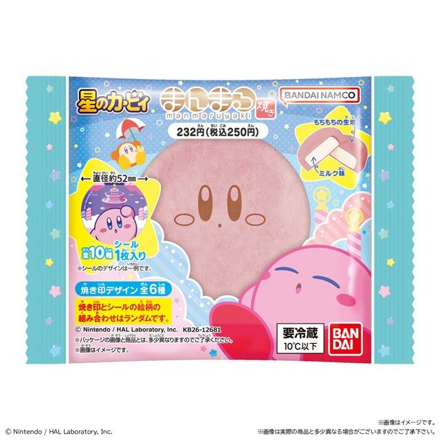 カービィのような、まんまるピンク色のもちもちな今川焼きに、6種類のカービィの焼き印を施したチルドスイーツです。カービィがまんまる焼きになったようなフェイスデザインや、まんまる焼きの上にカービィがちょこんと乗っているようなデザインなど、いろいろな表情やポーズの焼き印をお楽しみいただけます。生地の中にはミルク味のクリームが入っています。さらに、ランダムで1枚付属するキラキラのシールは全10種類。