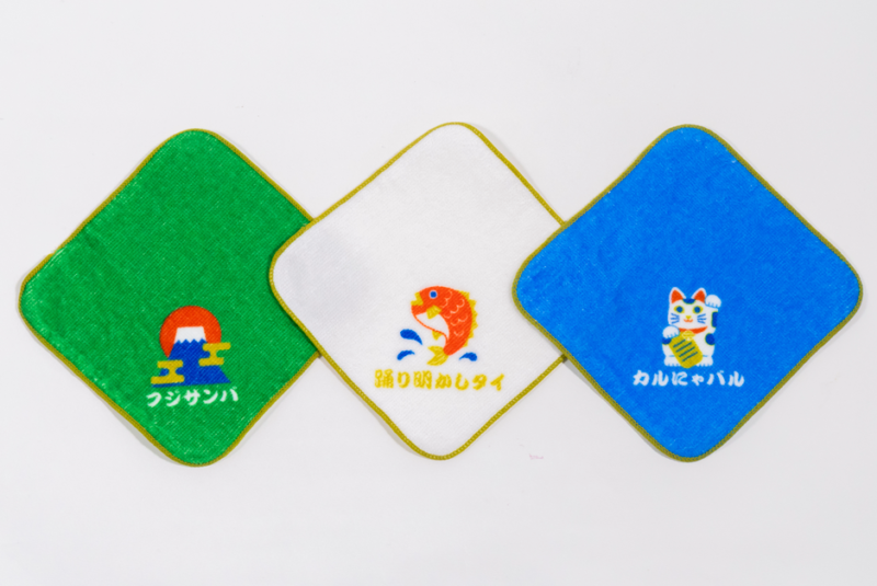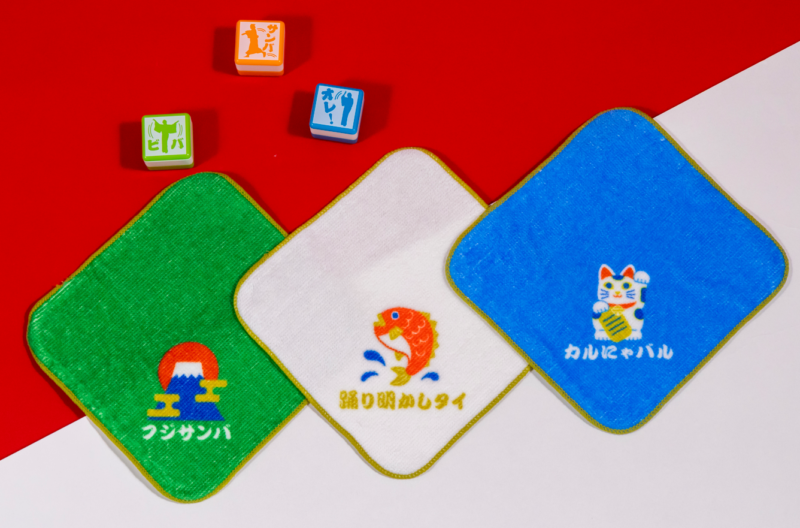 「マツケンサンバⅡ」の歌詞に合わせて「フジサンバ」「踊り明かしタイ」「カルにゃバル」がデザインされた福々しいハンドタオルです。全3種から好きなデザインをお選びください。
