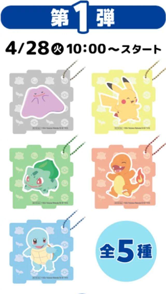 メタモン、ピカチュウ、フシギダネ、ヒトカゲ、ゼニガメの全5種がデザインされたアクリルパズルキーホルダーです。