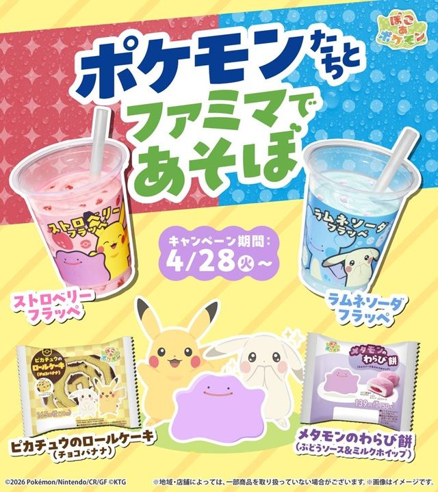 「ポケモンたちとファミマであそぼ」をテーマに、メタモンとピカチュウをデザインしたフラッペをはじめとするオリジナル商品を発売するほか、対象商品のご購入でオリジナルキーホルダーがもらえます。