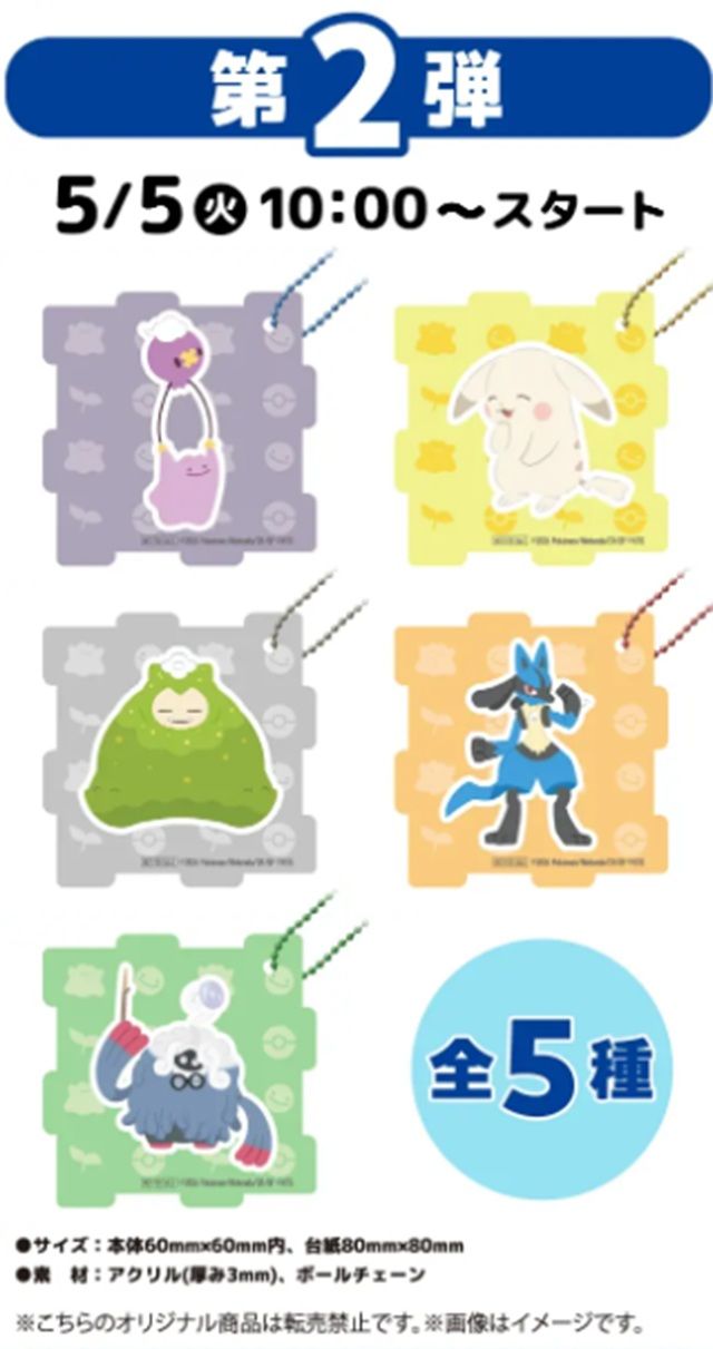メタモン&フワンテ、ピカチュウ(うすいろ)、カビゴン(こけむし)、ルカリオ、モジャンボ(はかせ)の全5種がデザインされたアクリルパズルキーホルダーです。