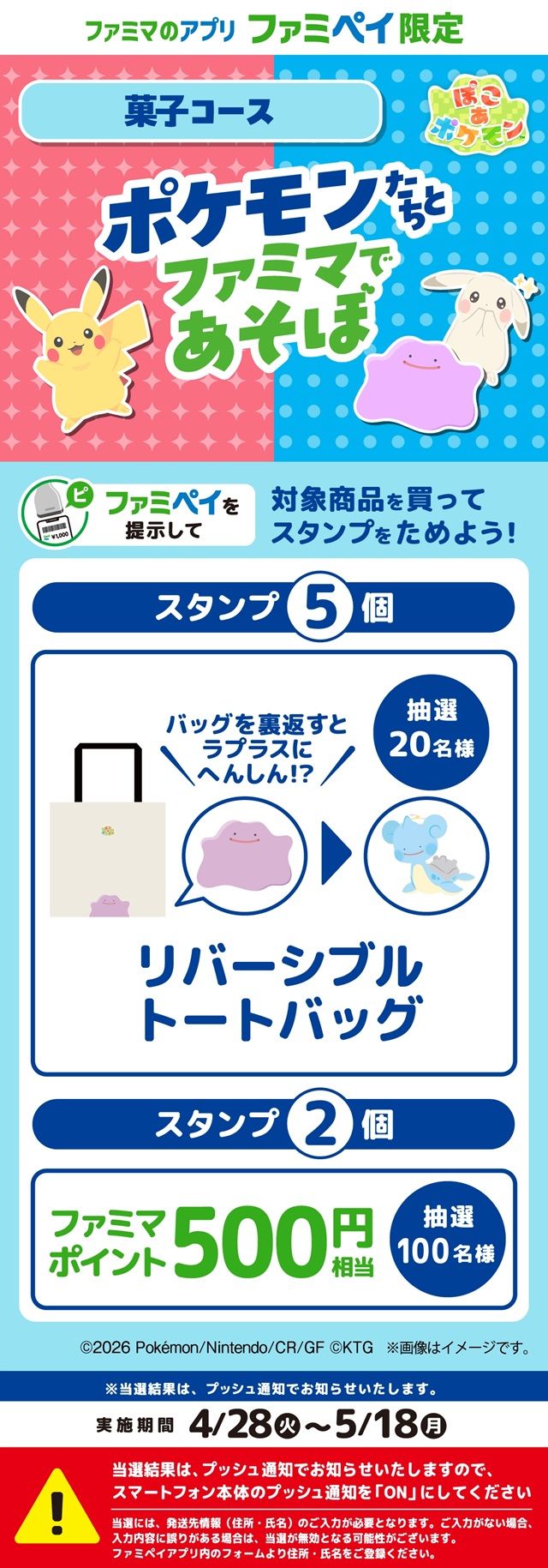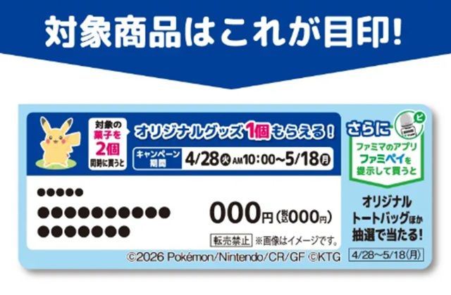 期間中「ファミペイ」を提示して、対象商品を購入すると、1商品につきスタンプが1個たまります。ためたスタンプ数に応じて、『ぽこ あ ポケモン』デザインのオリジナルトートバッグなどが当たります。