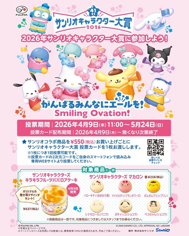 不二家洋菓子店で販売中のサンリオキャラクターズコラボ商品を税込550円お買い上げごとに「2026年サンリオキャラクター大賞 投票カード」を1枚お渡しします。