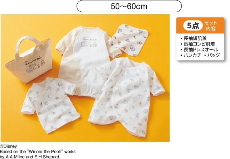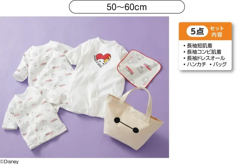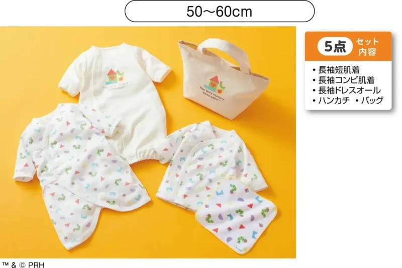 | セット内容(5点) | ・長袖短肌着(50cm) ・長袖コンビ肌着(50~60cm) ・長袖ドレスオール(50~60cm)・スタイ ・バッグ |