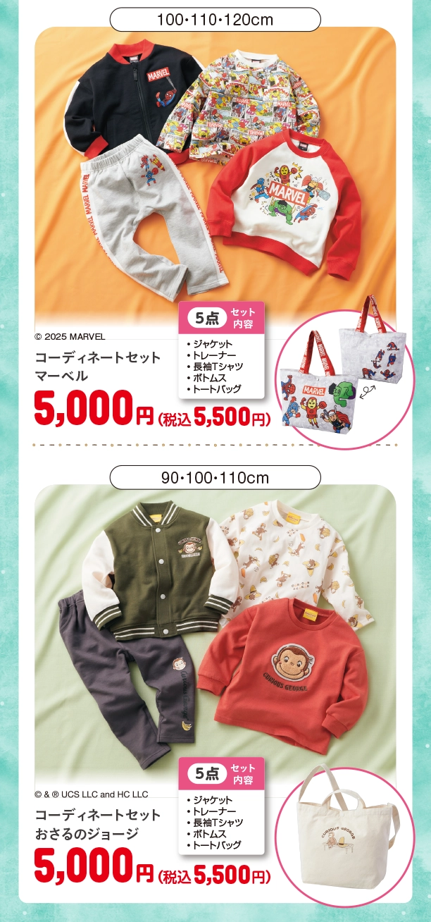 | セット内容(5点) | ・ジャケット ・トレーナー ・長袖Tシャツ ・パンツ ・バッグ |