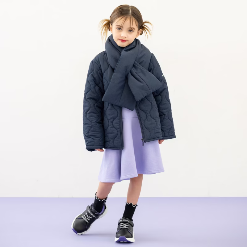 マフラー付き中綿ブルゾン: 表地は上品なタフタ、裏地は暖かなベロアを使用し、中綿入りでふっくらと優しい着心地です。お揃いの中綿マフラーがセットになっているのも嬉しいポイント。