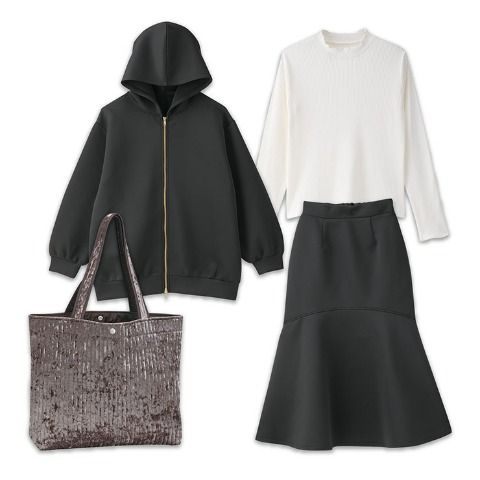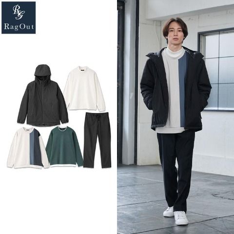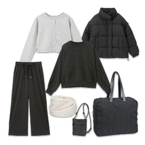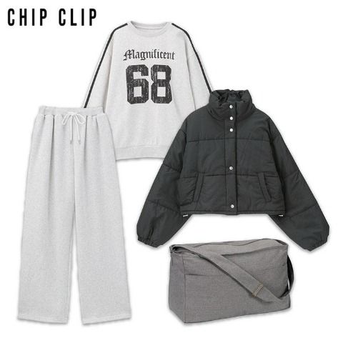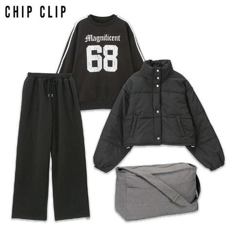 フード付き中綿ZIPアウター、ワンポイント裏起毛トレーナー、ストレッチ素材の総ゴムパンツ、冬のトータルスタイリングが1セットになっています。