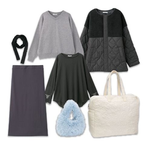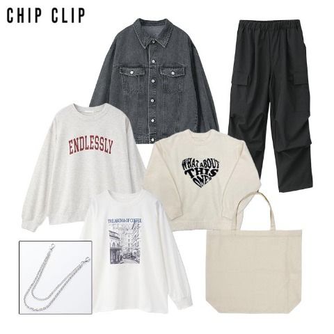 裏起毛プルオーバー、裏起毛ジップパーカ、チェック柄オーバーシャツ、デニムペインターパンツ、トートバッグの5点がセットに。