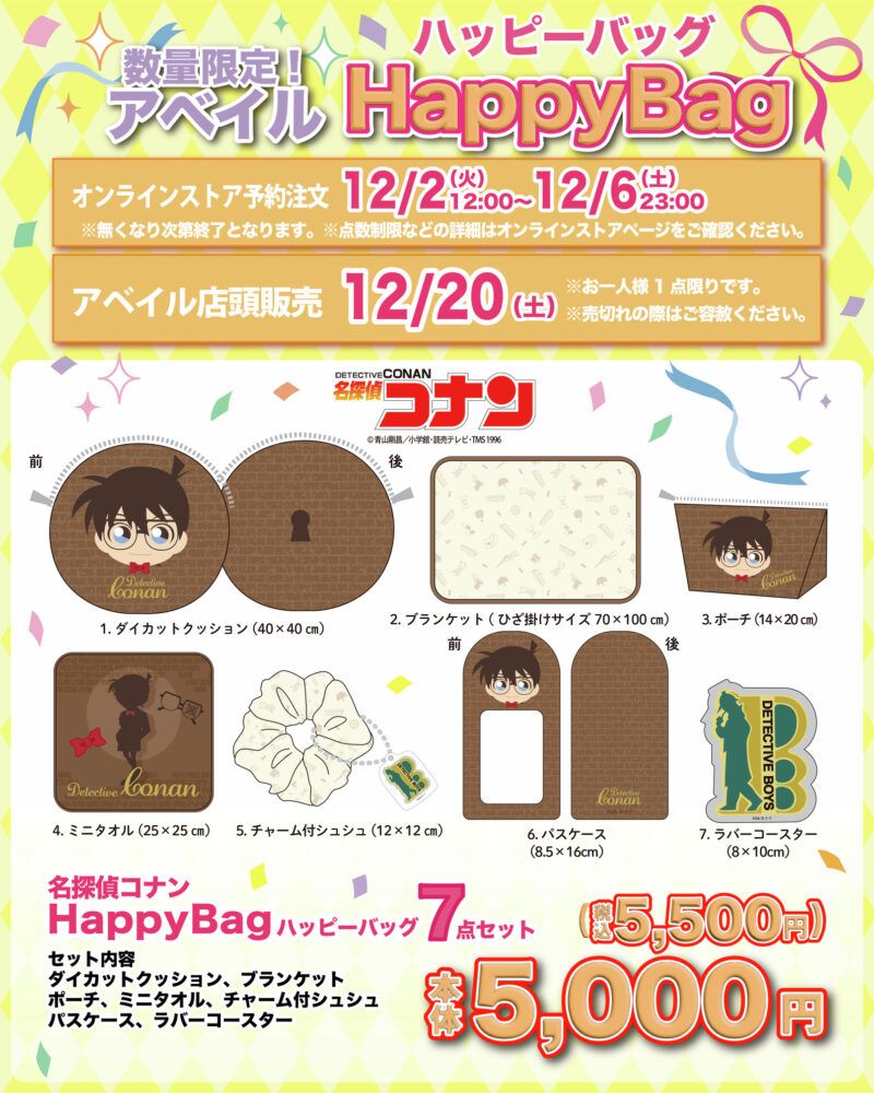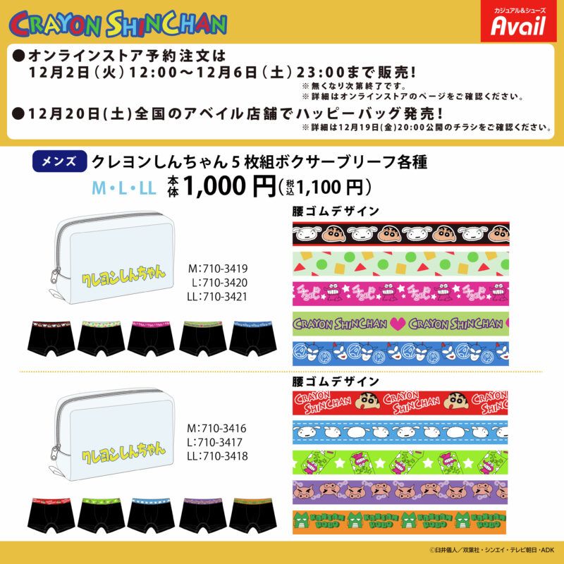 | 2025年 | 12月2日(月)12時より アベイルオンラインストアの先行販売 歳末ハッピーバッグ(福袋)12月21日(土)に分けて店頭販売 初売り福袋 1月1日の元日より店頭販売 | |