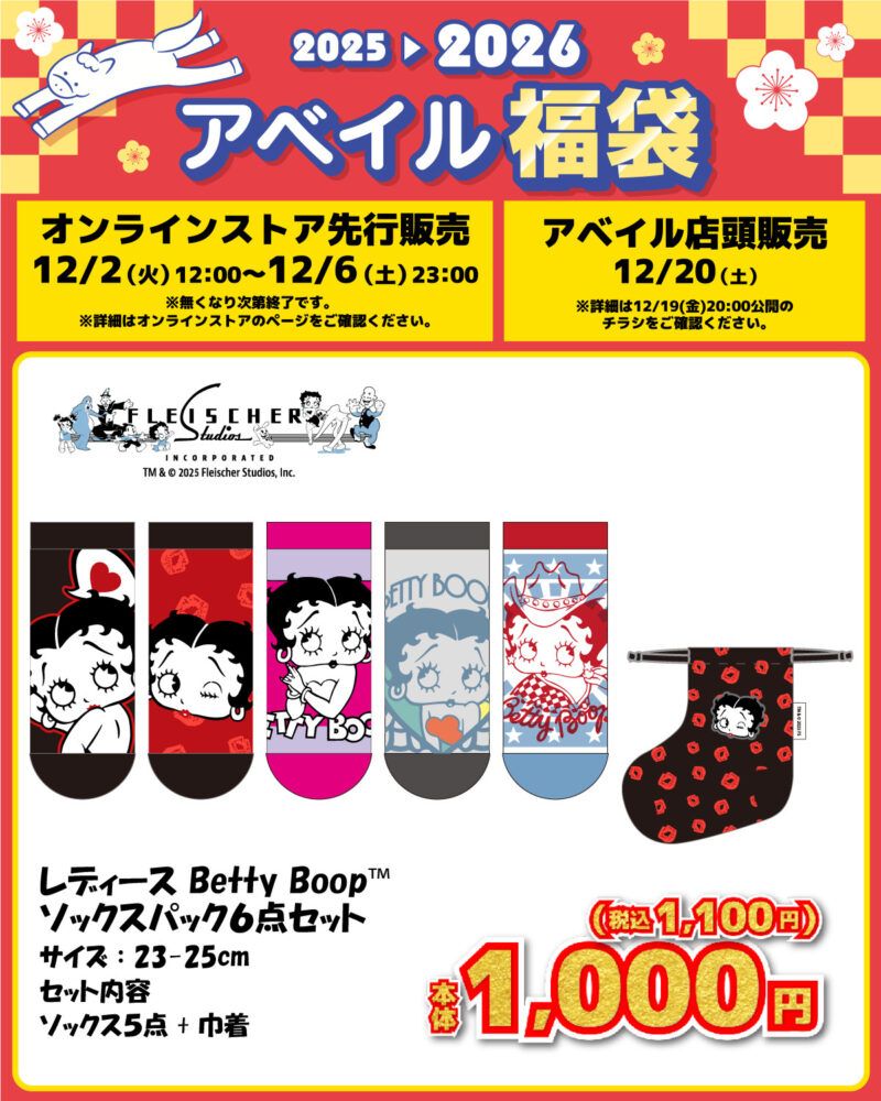 アベイル福袋2026『BETTY BOOP(ベティちゃん)』コラボ!ソックス+巾着のハッピーバッグが新発売!