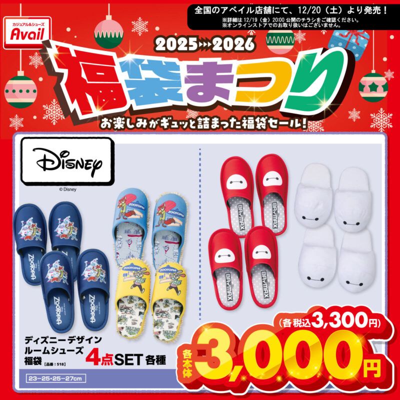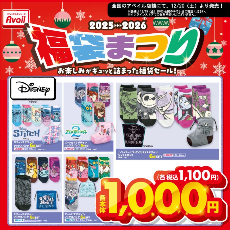 | 2026年 | レディース マリーハッピーバッグ5点セット 5,000円(税込 5,500円) レディース ベイマックスハッピーバッグ5点セット 5,000円(税込 5,500円) レディース ズートピア2ソックスパック6点セット 1,000円(税込 1,100円) レディース ナイトメアー・ビフォア・クリスマスソックスパック6点セット 1,000円(税込 1,100円) レディース スティッチソックスパック6点セット 1,000円(税込 1,100円) メンズ ズートピア2ソックスパック6点セット 1,000円(税込 1,100円) メンズ スティッチソックスパック6点セット 1,000円(税込 1,100円) ベイマックス ルームシューズ福袋4点セット 3,000円(税込 3,300円) ズートピア ルームシューズ福袋4点セット 3,000円(税込 3,300円) | |