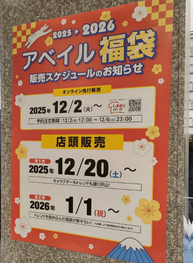 | 2026年 | 12月2日(月)12時より アベイルオンラインストアの先行販売 歳末ハッピーバッグ(福袋)12月20日(土) 初売り福袋 1月1日の元日より店頭販売 | |