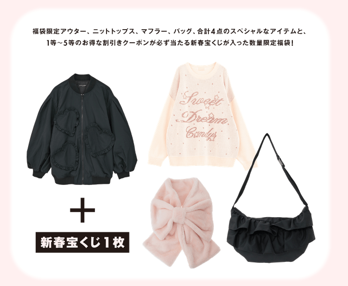 今回の中身は……総額70,000円相当の福袋限定アイテム(アウター、ニットトップス、マフラー、バッグ)合計4点と、新春宝くじ入り🌟