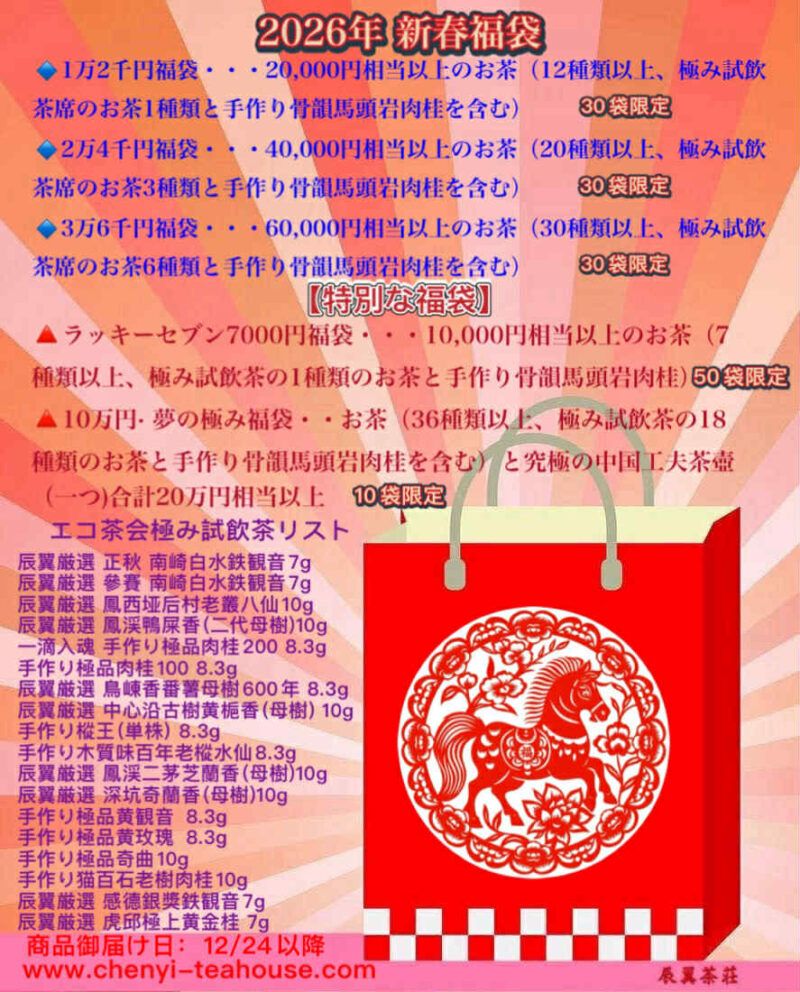 ☆1万2千円福袋・・・20,000円相当以上のお茶(12種類以上、極み試飲茶席のお茶1種類と手作り骨韻馬頭岩肉桂を含む) 30袋限定