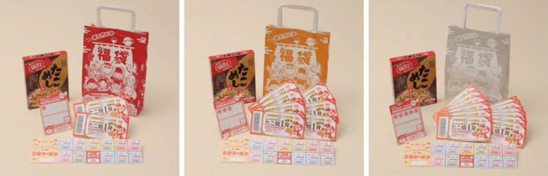 内容:「たこ焼1舟引換券(8個入り)2枚」 、銀だこ特製の 「たこめしの素」 、毎月使える 「100円引き(税込価格より)クーポン券」 、福袋限定 「銀だこスタンプカード スタンプ1個捺印」