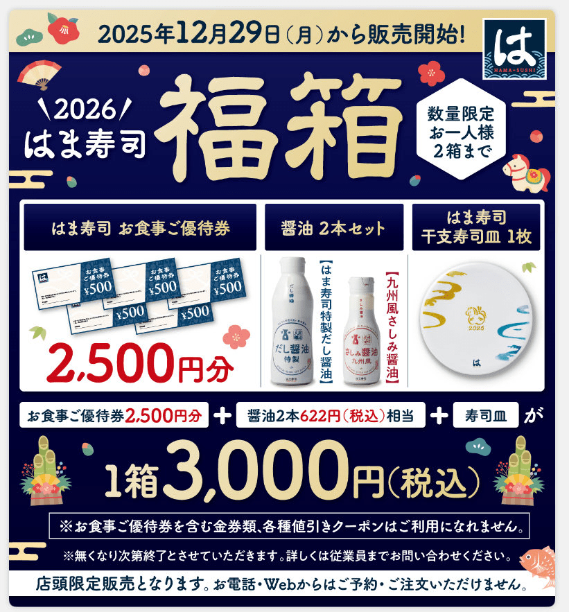 100円寿司チェーン「はま寿司」は、12月30日(土)から、「はま寿司の福箱(税込5,000円)」を全国の店舗で販売します。