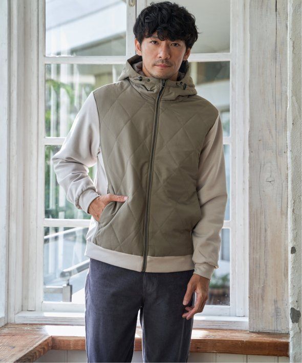アウターは着回し易さが魅力の薄綿入りアウター。布帛+ジャージ素材の異素材使いが魅力で春先も活躍!