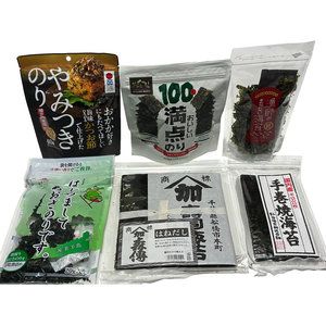 ●内容:はねだし海苔(30枚)×1、業務用手巻海苔(2切×30枚)×1、はじめましてあおさのり(20g)×1、漁師のまかない海苔(15g)×1、満点のり(切れ100枚)×1、やみつきのり(40g)×1