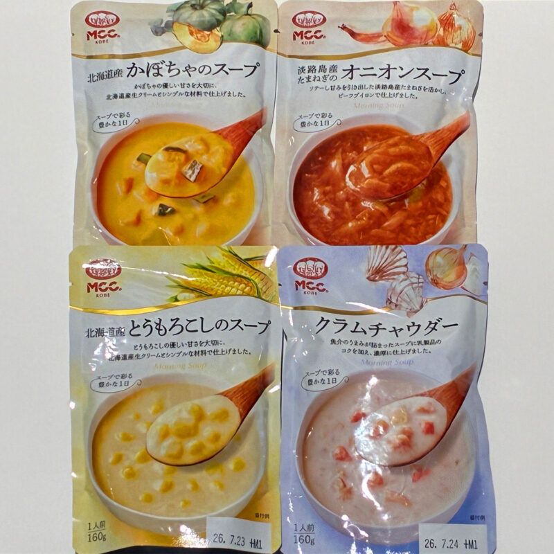 ●内容:北海道産かぼちゃのスープ(160g)×10、淡路島産たまねぎのオニオンスープ(160g)×10、北海道産とうもろこしのスープ(160g)×10、クラムチャウダー(160g)×10