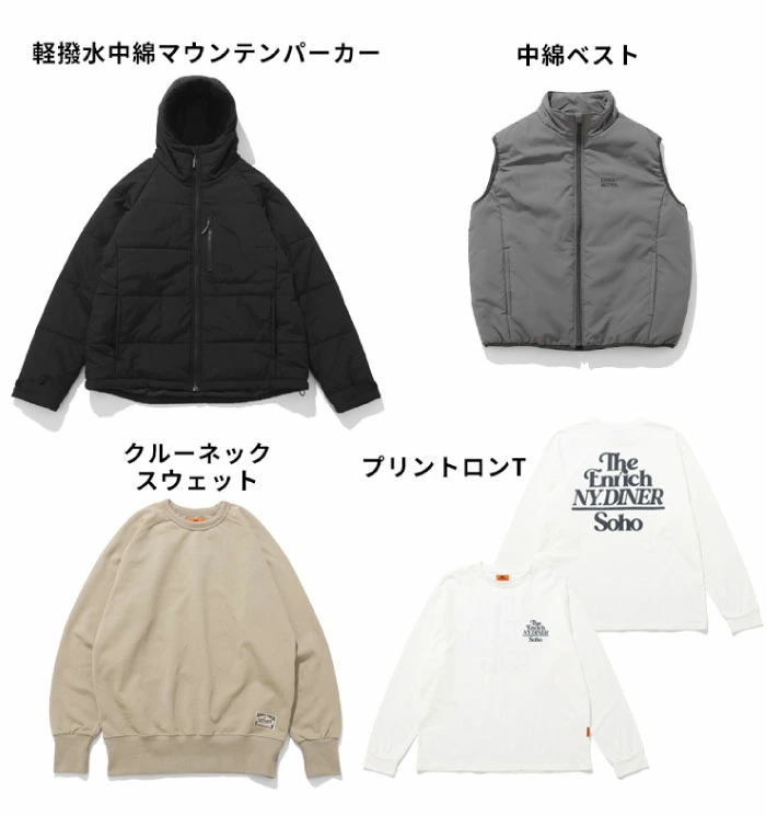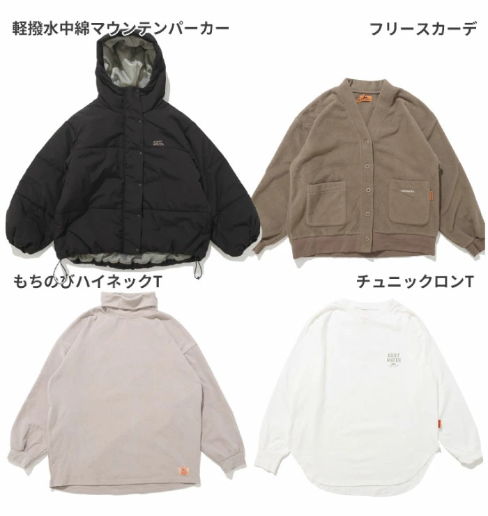 中綿マウンテンパーカー、シェルアウター、バックプリントポケットロンT、リバーシブルネックウォーマー
