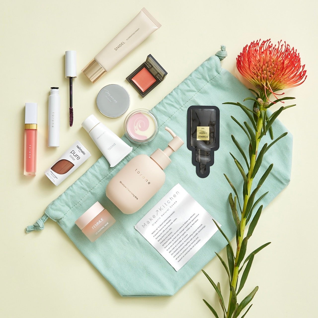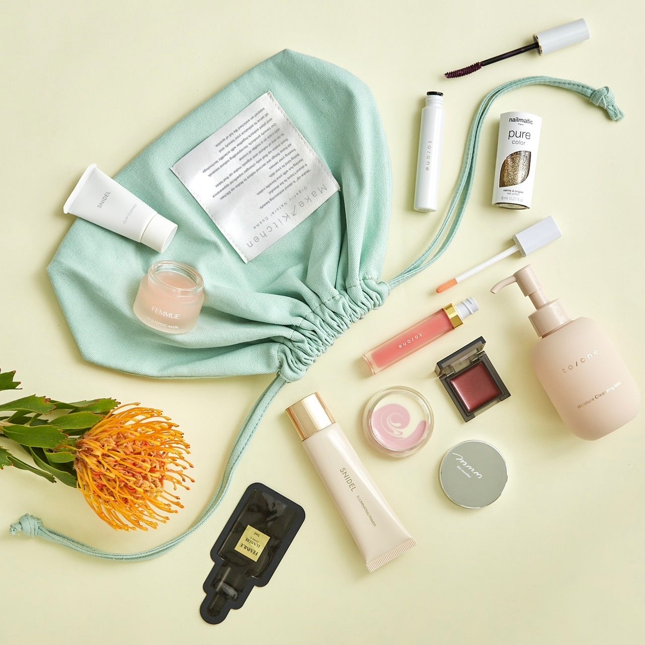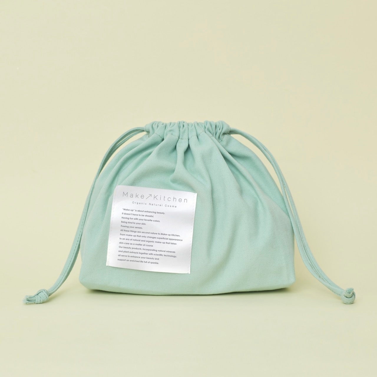 お気に入りのスキンケアやメイクがたっぷり入る、爽やかなミントグリーンカラーのオリジナルポーチがセットになります。