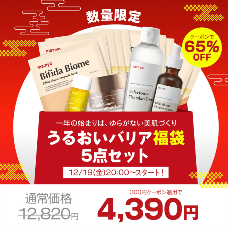 【manyo福袋2026】 ?ビフィダバイオームアンプルシートマスク10枚 ?ビフィダバイオームクリーム50mL ?ガラクトミートナー210ml ?ビフィダバイオームセラム50mL GIFT ピュアクレンジングオイル25mL