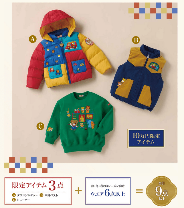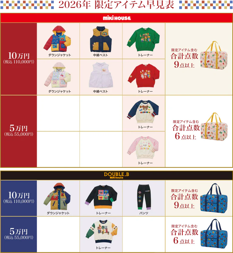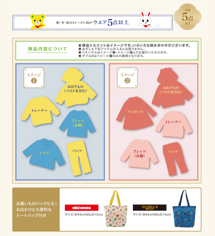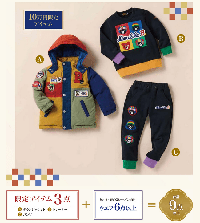 ミキハウス福袋2026年まとめ!予約、取扱店舗はどこ?販売方法は?種類、口コミ、値段!ダブルB、ホットビスケッツも!10万円、5万円、3万円、2万円で展開!