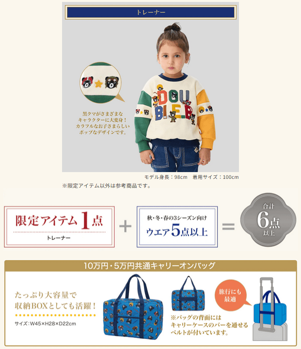 5万円福袋限定デザインのトレーナーを含む、秋・冬・春の3シーズンにお使いいただけるウエアが合計6点以上入ります。