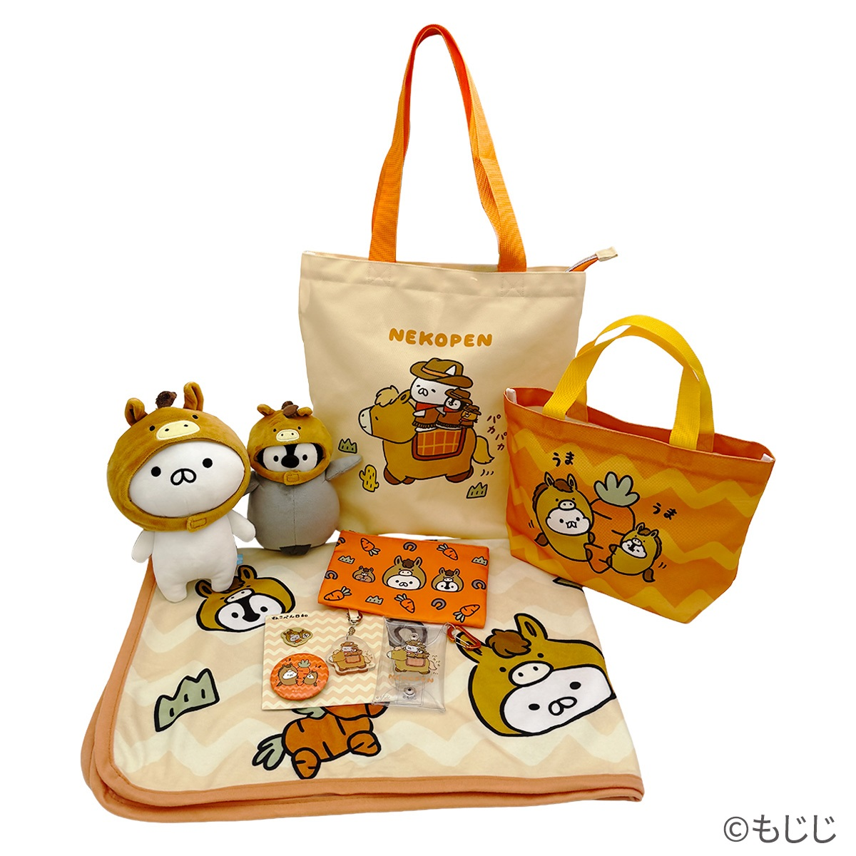 2025年の干支であるヘビ(巳)にちなんで、蛇使いに扮したねこくんとぺんちゃんのぬいぐるみのほか、スクエアポーチやマフラータオルなど、普段使いやお出かけにおすすめのグッズが入っています。