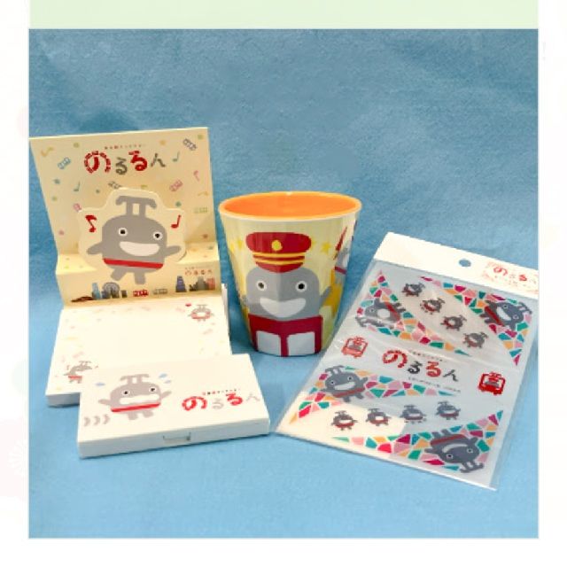 スイーツとのるるんを組み合わせた特別デザインのブランケットはふわふわな肌触りです。マグカップは保冷に優れたTHERMOSの真空断熱マグカップに、ワンポイントで踏切の前で手を振るのるるんがデザインされています。