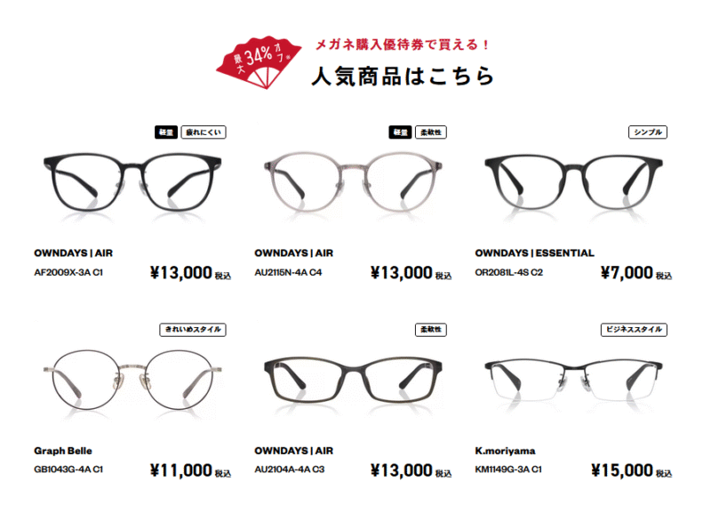 メガネを最大34%OFF(実質3,400円オフ)で、とてもお得な商品になります。