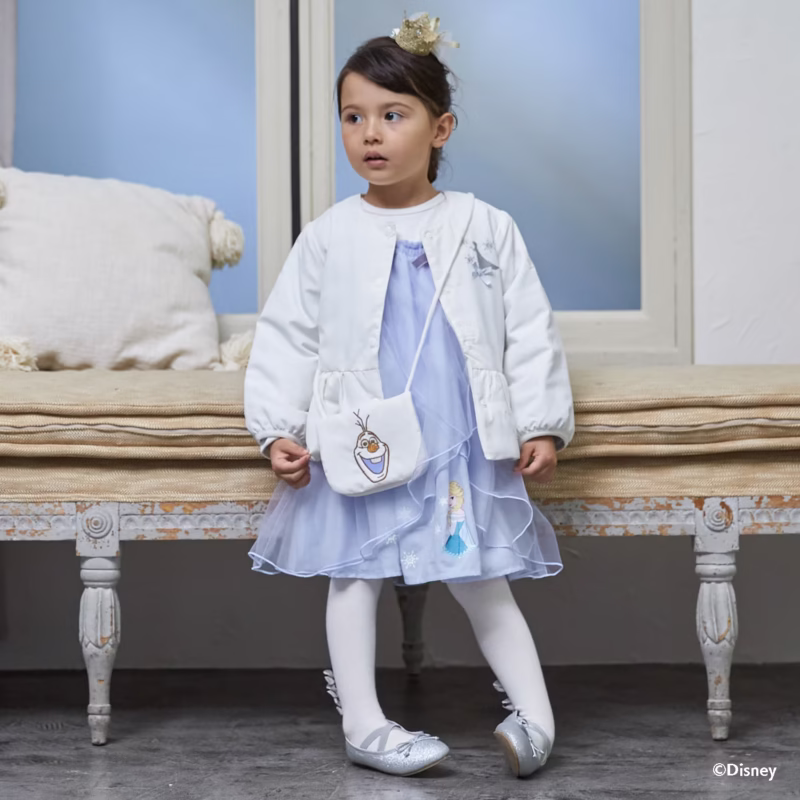 エルサがプリントされた女の子らしいドッキングワンピースは、ベロアリボンとチュールを取り入れてより可愛い雰囲気に仕上げました。