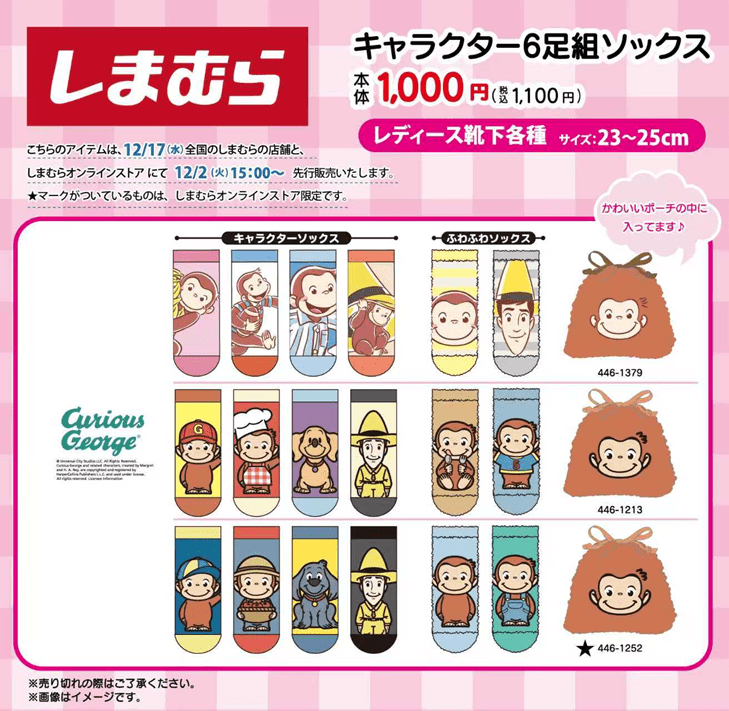 | 2026年 | レディース キャラクターソックス ハッピーバッグ 6点セット(おさるのジョージ) 1,000円(税込 1,100円) | |
