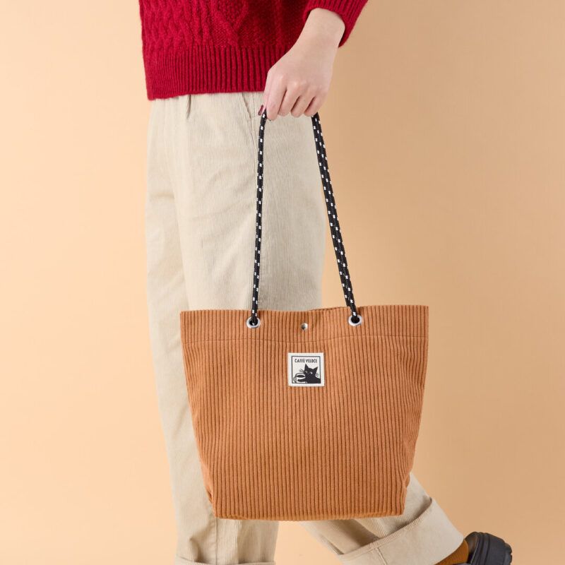 見た目にも暖かみのある「コーデュロイ素材」を使用したバックは、厚手の冬アウターを着ていても肩掛けしやすいように、肩ひもの長さにこだわりました。A4サイズのファイルがすっぽり入るサイズ感に加え、深めのマチ設計で、見た目以上の収納力を実現。カラーは、どんなファッションにも合わせやすいスモーキーブルー・キャラメルブラウン、オンライン限定のシャノアールブラックの3種類です。タグには『カフェ・ベローチェ』の世界観を感じていただけるように、マグカップに抱きついて暖を取る黒ねこのイラストをあしらっています。