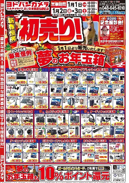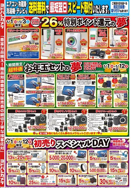 ヨドバシカメラでは、2026年1月1日~初売りで福袋の店頭販売も実施します。ほとんどの店舗では8時開始ですが、一部店舗では6時開店!