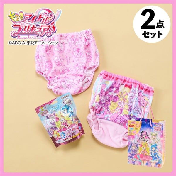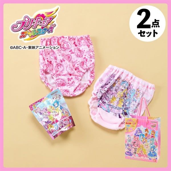 デリシャスパーティプリキュアのカラーショーツ2枚と、「びっくらたまご」という入浴剤の1個のセット商品です。入浴剤が溶けると、マスコットが出てきて、楽しいセット商品です。
