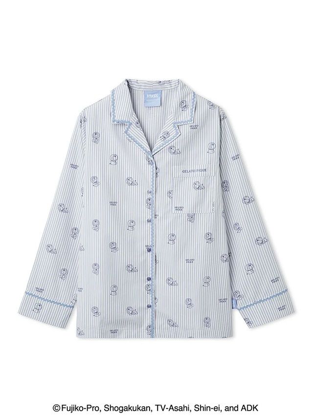 ハッピーなにこにこ顔やプンプン怒った顔、涙がこぼれそうなうるうる顔まで。ドラえもんとドラミの豊かな表情を描いたオリジナルアートが、喜怒哀楽いっぱいの毎日に寄り添う『ドラえもん』シリーズ第2弾。色んな表情のドラえもん&ドラミを、gelato piqueらしい柄に落とし込んだ布帛シャツです。キャラクターごとにディテールを変えているのがポイントで、ドラえもんはストライプ柄にキャッチーな波テープをあしらったデザインに。ドラミは小花柄をベースにピコレースを付け、フェミニンに仕上げました。胸ポケットのロゴ刺繍や、色を効かせたピスネームもさりげないポイントです。色はドラえもん柄のブルーと、ドラミ柄のレッドの2色をご用意。お揃いのロングパンツや同シリーズのカーディガンと合わせたり、メンズとのペア・コーディネートもお楽しみいただけます。