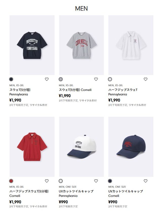 GU(ジーユー)『カレッジ』コラボを2026年春の新商品で発売します!アメリカを代表する名門大学「アイビー・リーグ」より「ペンシルベニア大学」「コーネル大学」が登場!
