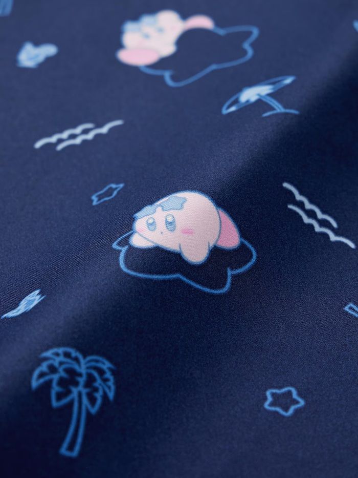 夜のビーチをイメージしたネイビーのサテン生地に、ワープスターに乗ったカービィの総柄プリント。