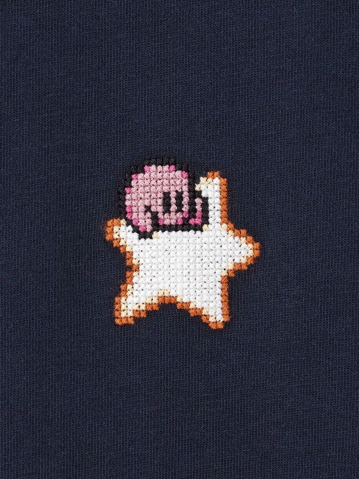 ワープスターに乗るカービィをクラシックなドットイラストのクロスステッチ刺繡で表現。
